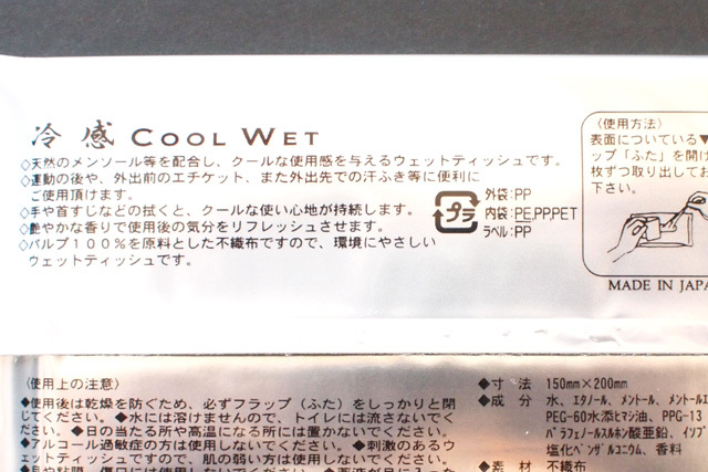 天然のメントールを5倍配合(弊社他製品比)した、クールな使用感を与えるウェットティッシュです。艶やかな香りで使用後の気分をリフレッシュします。手や首すじなどを拭くと、クール感が持続します。夏場の節電対策や、運動の後、また気分をリフレッシュさせたい時などにおすすめです。